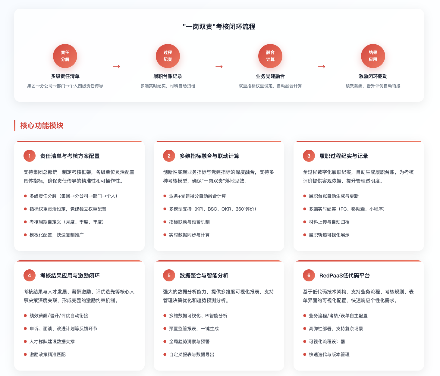 | 责任清单管理 | 多级配置、动态调整、台账纪实 | 支持业务责任清单,党建需扩展 | 支持业务责任清单,党建需扩展 | 支持业务责任清单,党建需扩展 |