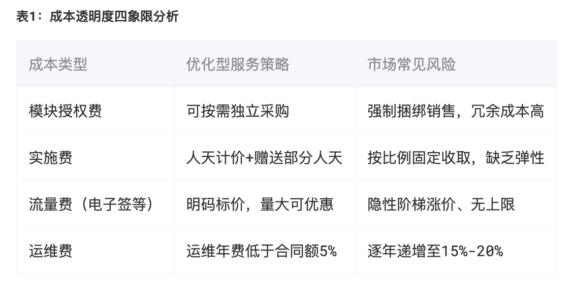 成本类型 优化型服务策略 市场常见风险 模块授权费 可按需独立采购 强制捆绑销售,冗余成本高 实施费 人天计价+赠送部分人天 按比例固定收取,缺乏弹性 流量费(电子签等) 明码标价,量大可优惠 隐性阶梯涨价、无上限 运维费 运维年费低于合同额5% 逐年递增至15%-20%
