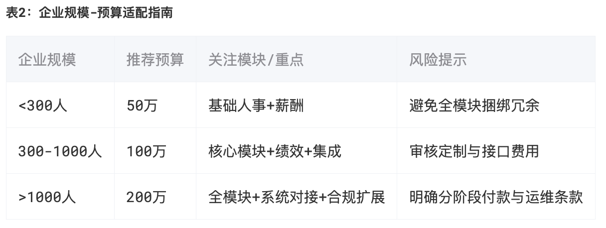 企业规模 推荐预算 关注模块/重点 风险提示 <300人 50万 基础人事+薪酬 避免全模块捆绑冗余 300-1000人 100万 核心模块+绩效+集成 审核定制与接口费用 >1000人 200万 全模块+系统对接+合规扩展 明确分阶段付款与运维条款