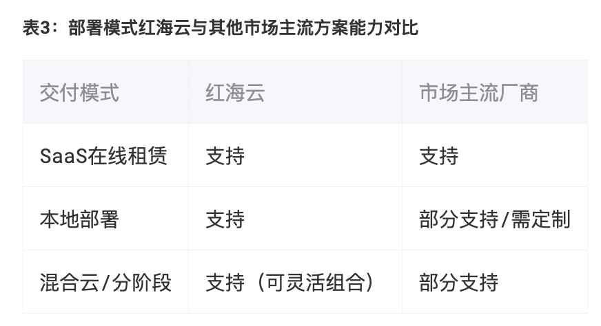 交付模式 红海云 市场主流厂商 SaaS在线租赁 支持 支持 本地部署 支持 部分支持/需定制 混合云/分阶段 支持(可灵活组合) 部分支持