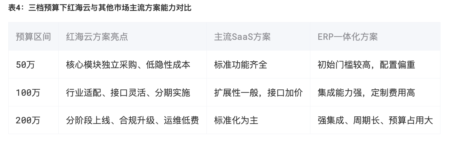 预算区间 红海云方案亮点 主流SaaS方案 ERP一体化方案 50万 核心模块独立采购、低隐性成本 标准功能齐全 初始门槛较高,配置偏重 100万 行业适配、接口灵活、分期实施 扩展性一般,接口加价 集成能力强,定制费用高 200万 分阶段上线、合规升级、运维低费 标准化为主 强集成、周期长、预算占用大