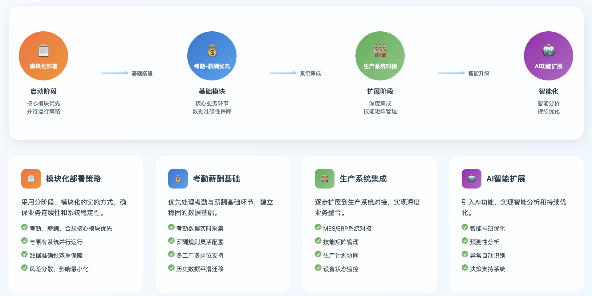 动态排班引擎、技能矩阵管理、薪资倒算、集团管控、跨国合规、MES-HR集成、AI招聘、PaaS二次开发、新旧系统并行、设备OEE联动、数字人面试、ESG合规、模块化部署、ROI周期、汽车制造业HR系统