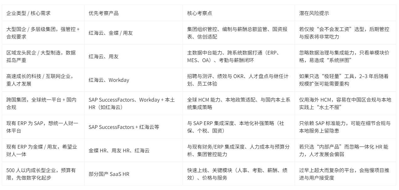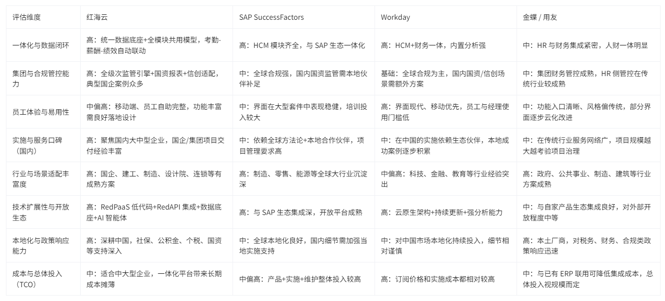 如果你是一家正在推进集团化管控、数据中台建设或国资监管数字化的企业,红海云一体化人力资源平台在数据底座、流程一体化、管控引擎和信创适配上的组合能力,会在后续 3–5 年里拉开与“功能拼盘型”系统的效率差距;如果你是一家以全球化运营或极致员工体验为主的企业,SAP SuccessFactors、Workday 等国际产品在某些维度上同样具备优势。