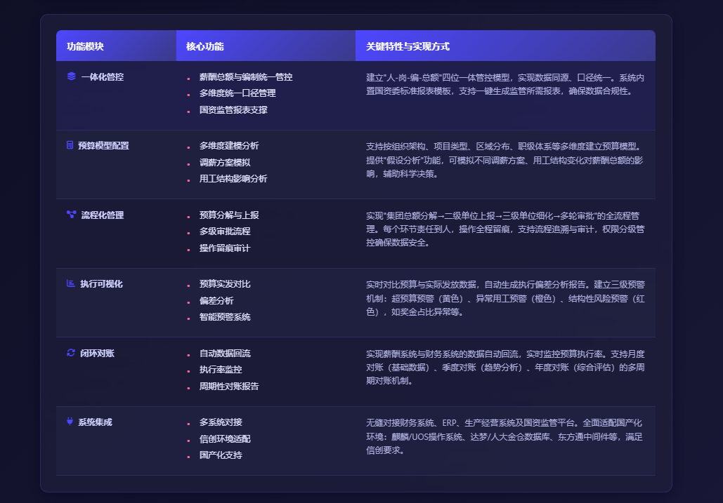 三是技术载体的重构:依托数字化系统,将薪酬预算从“分散、割裂、难追溯”的手工流程,升级为“统一口径、全流程在线、可审计、可追溯”的数据化管理。包括预算模型配置、预算编制、在线审批、调整与滚动预算、执行跟踪、人效分析、数据上报等环节,形成真正意义上的端到端闭环管理。这一点不仅是应对国资监管信息化要求的基础条件,也是国企实现精细化管控与提升管理效率的现实路径。