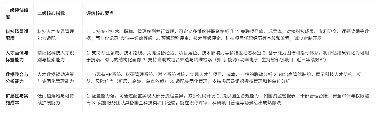 很多国企在对比 3~5 套 HR 系统时,会被演示中的“炫酷界面”和“AI 话术”扰乱判断,真正上线后却发现:科技项目、职称评审、科研成果这些关键场景支撑有限。要评估一套系统是否适合建设和运营科技人才库,需要建立一套更贴近业务的实用性指标,而不是只看“模块全不全”。这一评估框架可从科技场景适配度、人才画像与标签能力、数据整合与分析能力、扩展与实施成本四个维度展开。