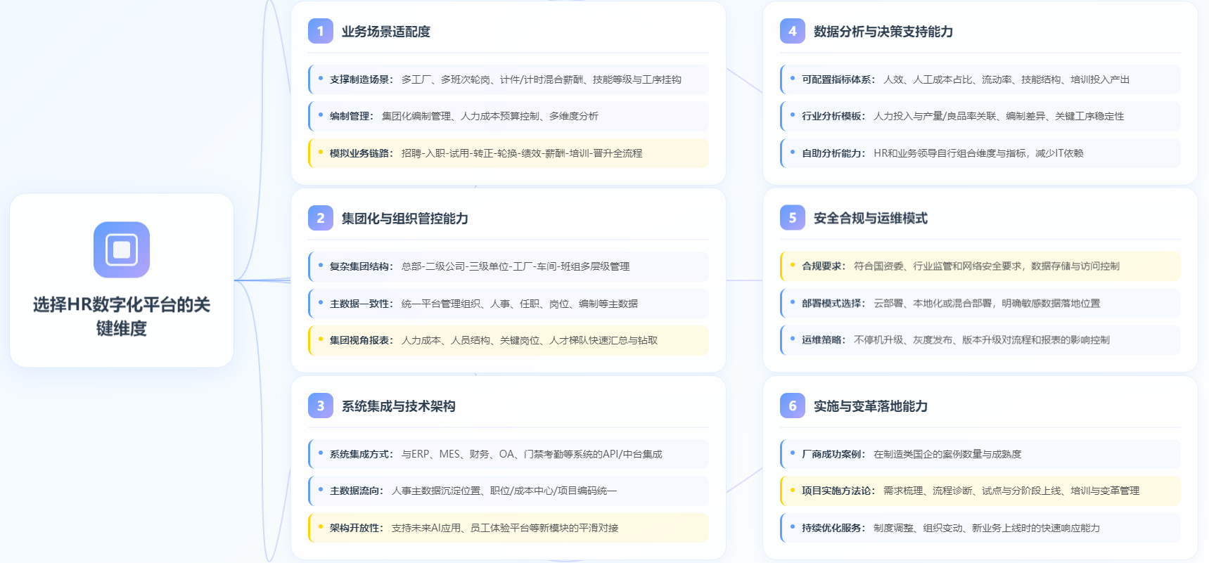 制造类国企在人力资源数字化平台选型上,难度远高于一般民企或单体制造企业。一方面,需要兼顾“国企管控 + 制造场景 + 多层级组织”的复杂性;另一方面,又要考虑已有信息系统和历史制度的迁移成本。若只看功能清单,很容易“看起来都能做”;真正上线后,才发现要么制度无法落地,要么和业务系统割裂,甚至引发组织抵触。构建一套清晰的评估维度,有助于在招标、选型和内部决策阶段,把注意力聚焦到“与自身场景最相关、风险最高”的要素,而不是被厂商的功能演示和营销语言牵着走。