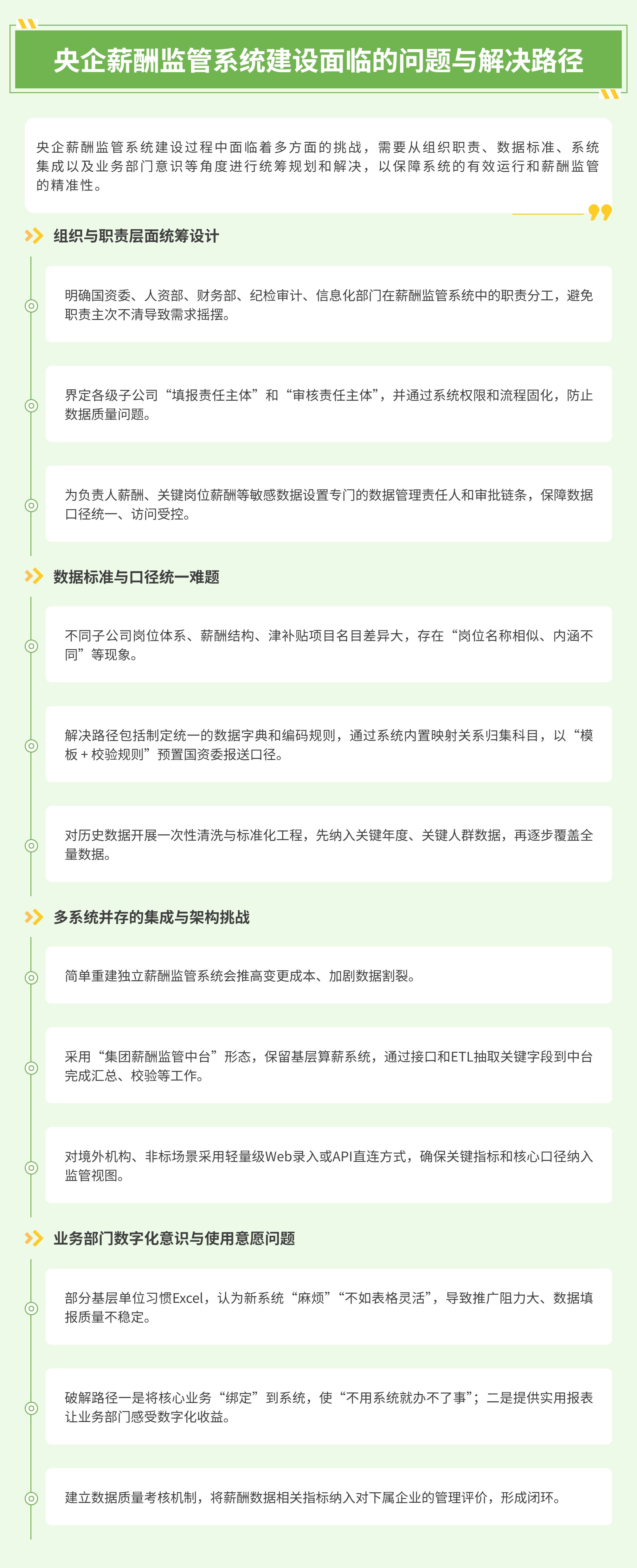 国资委近年来大力推进的薪酬管理信息系统建设,使这种差异化监管需求有了统一的数字化承载平台。通过建设覆盖“全员、全级次、全口径”的系统,监管部门希望打通母公司、各级子公司乃至境外机构的薪酬数据,实现多级法人、多用工类型的集中采集、统一口径核算与可视化分析。对大型央企来说,这意味着原本依赖Excel、分散在不同子公司HCM系统中的数据,必须被重新梳理、标准化并纳入一套可穿透、可追溯的统一平台,否则工资总额预算管理、考核审计、信息披露都难以做到真正“有据可查”。