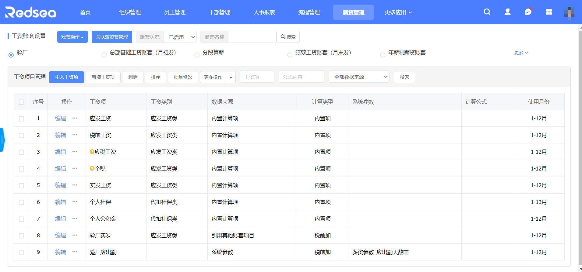 系统内置智能化公式编辑器,支持自定义工资项目和计算公式,满足职能人员计薪、一线工人计件工资、销售人员提成等多种薪酬计算规则;提供向导式公式计算与试算,零基础用户也能轻松设置公式,降低了薪酬计算的复杂度的同时确保薪资核算的准确性。