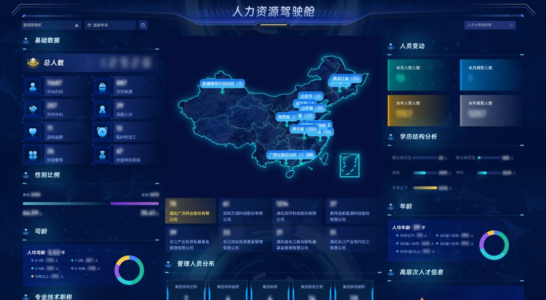 依托完善的数据治理体系,集团深挖数据价值,依托红海eHR系统构建集团级可视化智慧管理平台,为人力资源管控和决策提供精准支持。首先,通过人力资源驾驶舱,实现多维度数据的动态呈现和深度分析,为管理者提供人才结构热力图、流动趋势雷达图、培养效果对比图等人力资源数据视图,直观呈现集团人力资源全局动态。此外,平台支持定制化报表,从国资监管要求的汇总数据到多模块专题分析,灵活满足全场景、多层次的管理需求,显著提升数据应用的效率与深度。