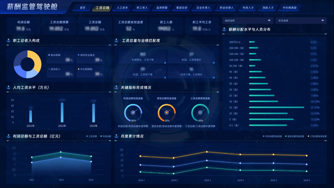 在关键业务场景中,平台以智能化分析助力动态管控与风险预警。例如,通过薪酬监管大屏,系统深度整合薪资数据并结合AI模型进行分析,实时监控预算执行与工资总额动态,薪酬超限时自动预警,实现薪资管控的全链条智慧覆盖。在人才管理方面,平台嵌入人才九宫格、继任者匹配等智能工具,动态评估人员绩效、潜力与岗位匹配度,为梯队建设与继任规划提供科学依据。同时,借助NLP技术,对员工评价等非结构化数据进行归档与标签化处理,精准绘制人才画像,进一步优化关键岗位管理。