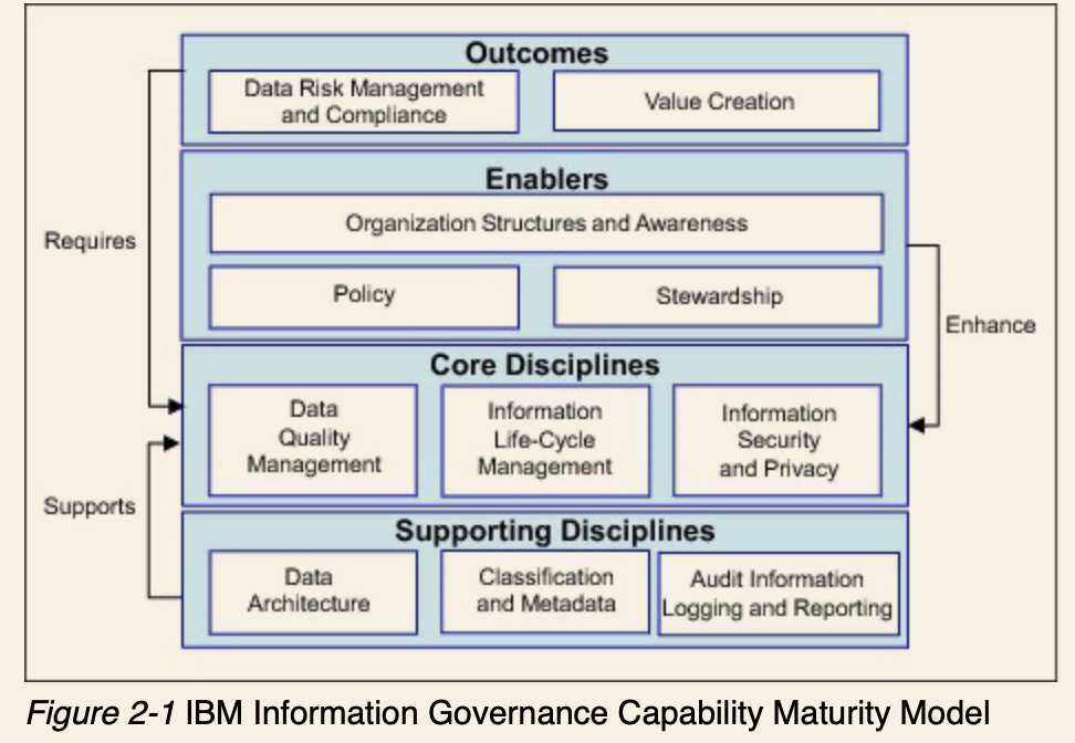 为了推动数据治理和信息治理的行业标准化,IBM在2004年就发起了IBM数据治理协会(IBM Data Governance Council),2006年推出了数据治理成熟度模型,2010年将“IBM数据治理协会”改名为“IBM信息治理协会”(IBM Information Governance Council),以此强调信息治理是业务关心的问题,而非数据或技术部门关心的问题。