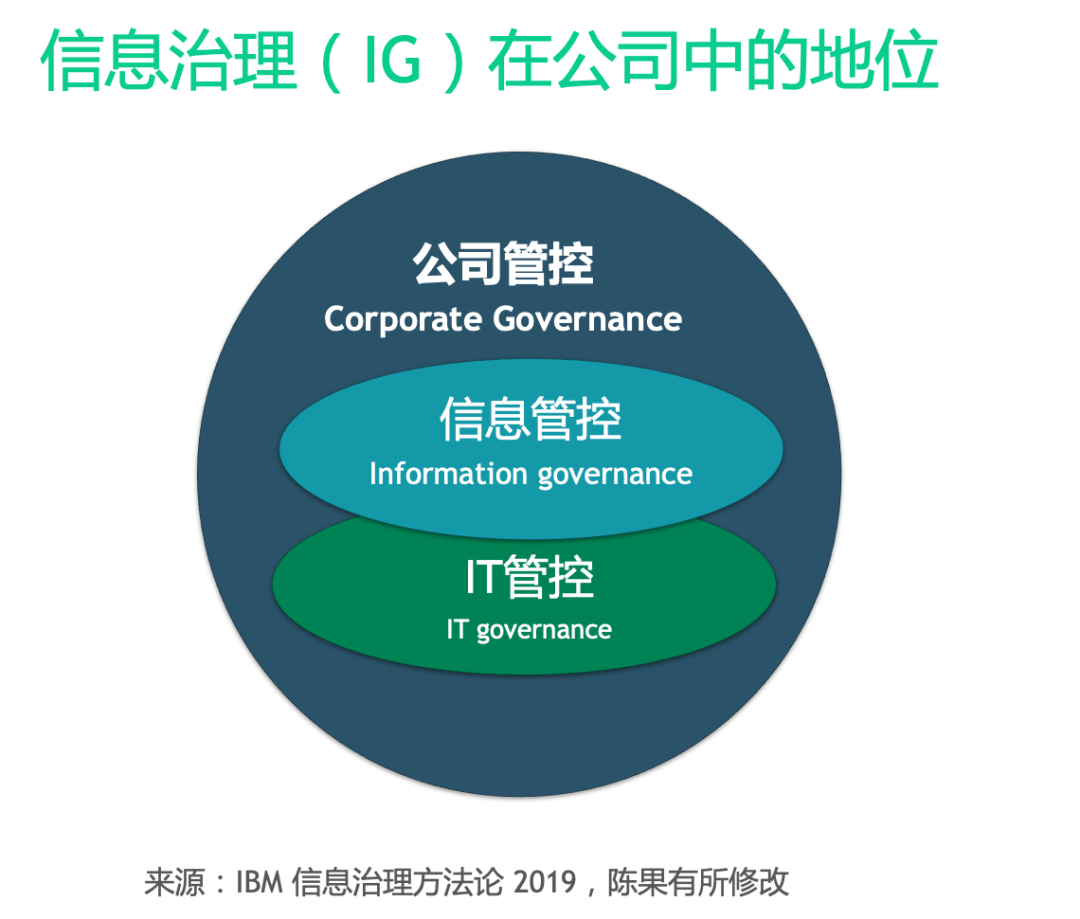 信息治理(information governance,简称IG)指的是应用于数据的业务和法律环境。数据在获取、使用、保留和销毁等环节中的政策、流程和权属。这些领域包括:信息访问-谁可以读取/更新数据,信息生命周期管理-根据企业和监管要求(如SEC、GDPR、HIPPA等)所经过的状态。