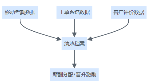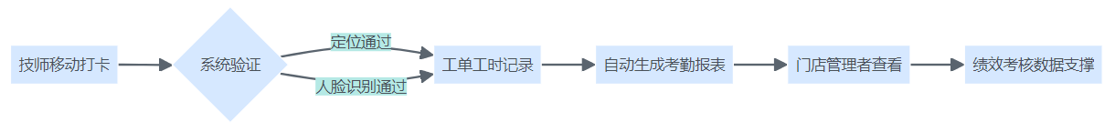 技师移动考勤数据流转结构图,展示打卡、验证、工时记录、报表生成与绩效数据支撑流程。
