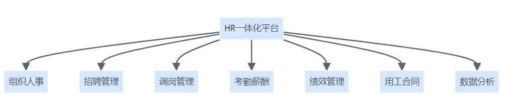 HR一体化平台集成组织人事、招聘、调岗、考勤薪酬、绩效、合同及数据分析的结构图