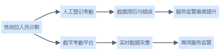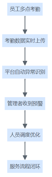 数字考勤平台实现多点考勤数据实时上传,自动异常识别与预警,驱动人员调度优化,实现服务流程闭环。
