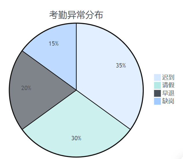 数字考勤平台生成的考勤异常分布图,有效展示物业员工迟到、早退、缺岗与请假比例,辅助管理者精准识别问题。