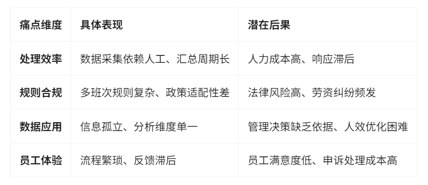 考勤数据与生产系统的排班计划、财务系统的薪资计算彼此割裂。生产主管无法预判次日可用人力,HR难以分析不同班次效率,财务部门每月耗费大量时间进行薪资稽核。管理层意识到,考勤并非孤立环节,而是串联人效、成本、合规的关键节点。
