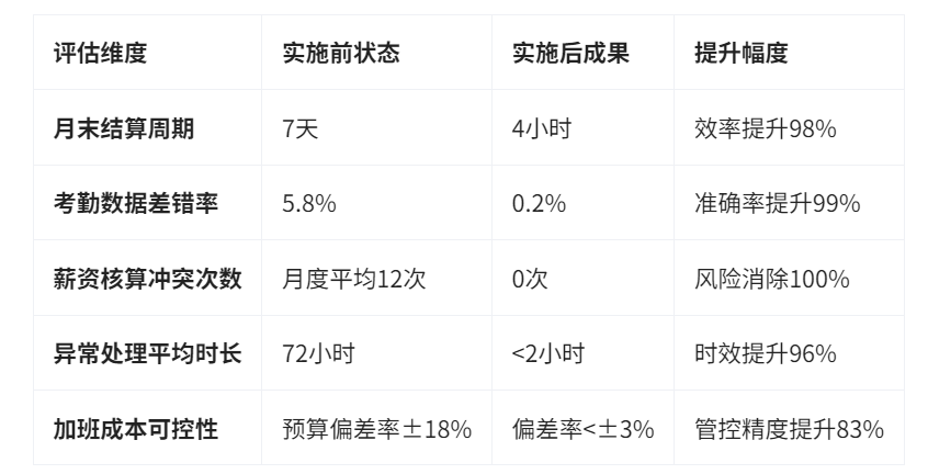 项目实施仅三个月后,该制造企业的考勤管理体系发生了颠覆性变革: