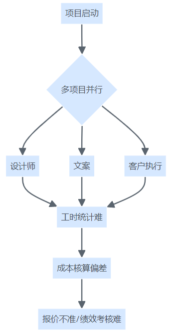 广告传媒公司多项目并行下,岗位工时统计难导致成本核算与绩效考核偏差的流程图