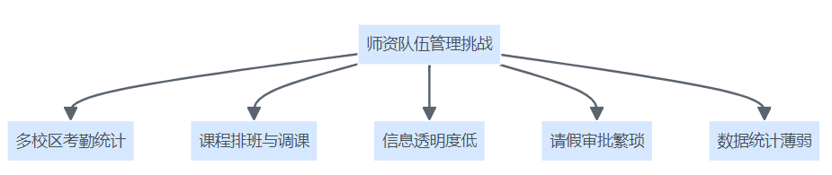 数据统计与决策支持薄弱:多校区、多学段数据分散,管理层难以实时掌握师资队伍动态,影响战略决策效率。