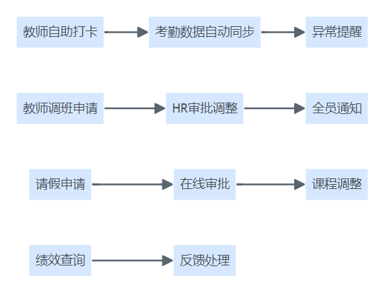 请假与审批流程繁琐:教职工请假流程链路长,审批环节多,常因沟通滞后导致教学安排混乱。