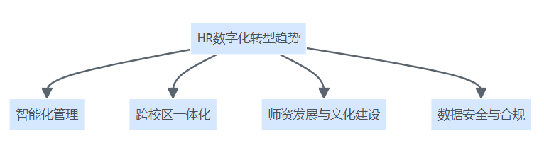 随着技术持续进步和教育行业管理需求的提升,员工自助平台将为教育集团HR数字化转型带来更多可能性。展望未来,行业发展呈现以下趋势: