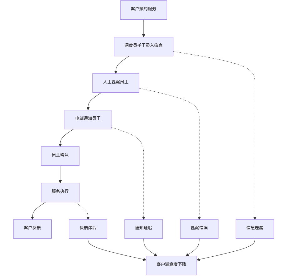 家政企业传统调度流程中,信息录入、匹配、通知、反馈等环节易出现遗漏、错误和延迟,影响客户满意度。