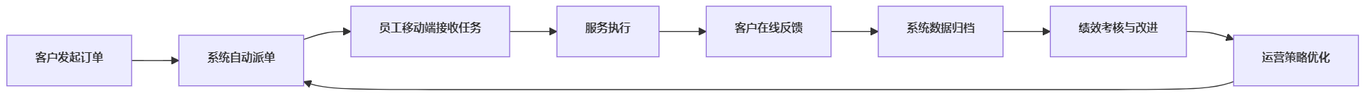 服务员通过移动端接收派单,完成服务后上传电子反馈,客户可在线评价。系统自动生成服务记录和满意度数据,管理层可随时调阅,便于绩效考核与流程改进。