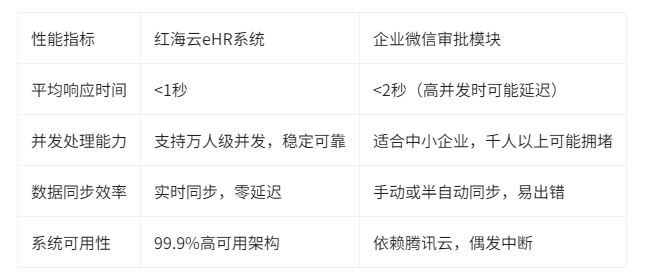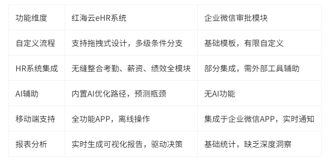 本文将深入对比智能审批流程与企业微信审批模块的核心差异。企业微信作为腾讯推出的企业沟通工具,其审批模块以轻量高效著称,适合日常简单事务处理。但它在复杂人力资源管理场景中,常暴露集成度不足、自定义功能有限等问题。反观红海云eHR系统,围绕人员招募、基础人事、考勤工时、薪资绩效等业务场景构建完整解决方案,其智能审批流程不仅实现自动化路由与实时数据同步,更深度嵌入人力生态链,确保全平台组织人岗数据的智能联动。通过本文分析,读者将清晰了解二者在功能、性能、用户体验上的优劣,并洞察红海云eHR如何通过一体化平台赋能企业高效管理。文章基于真实行业案例(已脱敏处理),结合可视化图表,旨在为人力资源管理者提供决策参考,助力企业在智能时代抢占先机。