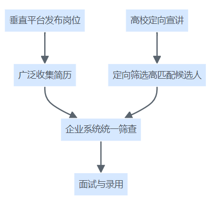 企业多渠道实习生招聘流程结构图,展示线上广撒网与线下定向深耕的结合