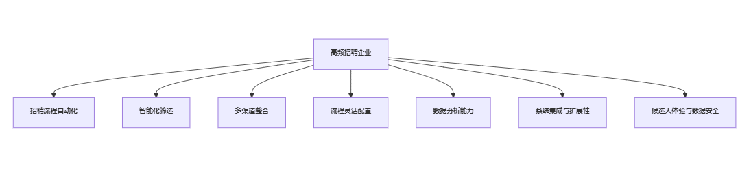 高频招聘企业在招聘管理系统选型时,涉及自动化、智能筛选、多渠道整合、灵活配置、数据分析、集成扩展及数据安全等七大需求。