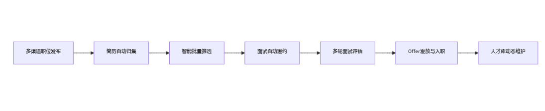 高频招聘企业的招聘全流程包括多渠道发布、简历归集、智能筛选、自动邀约、面试评估、Offer发放以及人才库动态维护。