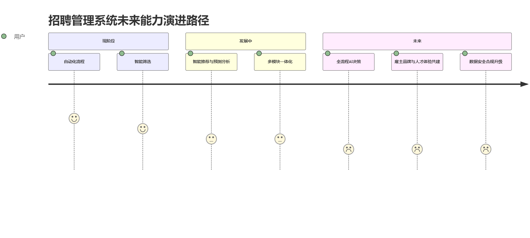 招聘管理系统能力从自动化流程、智能筛选,逐步发展到智能推荐、平台一体化,最终迈向AI决策、雇主品牌共建和数据安全合规。