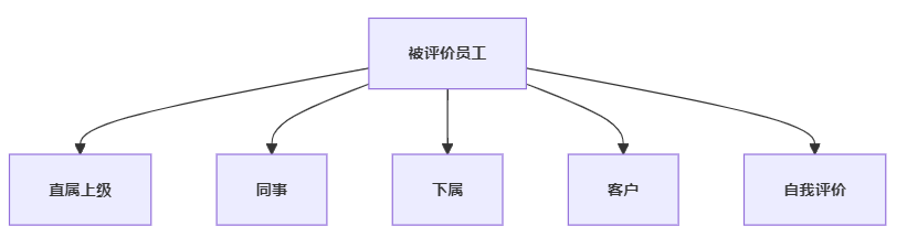 360度反馈型绩效评价关系图,展示员工与上级、同事、下属、客户、自我评价等多方反馈主体的连接关系。