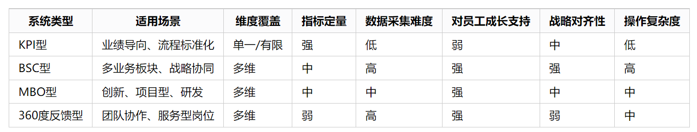 主流绩效考核系统关键指标对比表,涵盖适用场景、维度覆盖、定量能力、数据难度、员工成长、战略对齐、操作复杂度等维度。