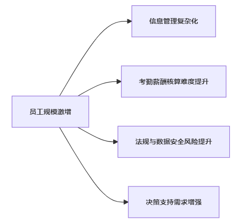 企业员工规模激增后,信息管理、考勤薪酬、法规安全与决策支持等挑战同步上升的结构关联图