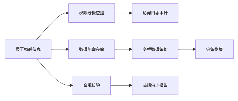 智能人事系统围绕权限管理、数据加密、备份与合规校验的全流程安全管理示意图