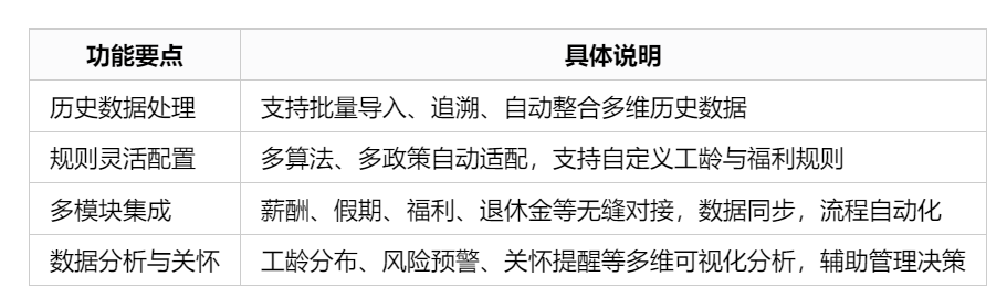 表格展示工龄管理系统在数据处理、规则配置、多模块集成和数据分析上的核心功能。