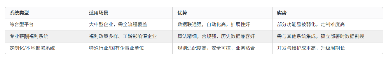 表格对比综合型平台、专业薪酬福利系统和定制化本地部署系统在工龄管理场景下的适用性与优劣。