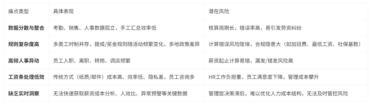 表1:零售连锁门店薪资管理痛点与潜在风险