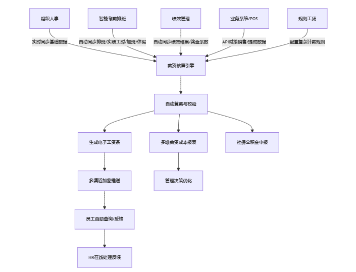 数据驱动,打破孤岛:基于统一平台,员工档案、考勤打卡、排班计划、绩效结果、销售/提成数据(通过接口集成POS/业务系统)自动汇聚至薪资计算引擎,彻底告别手工搬运与数据打架。