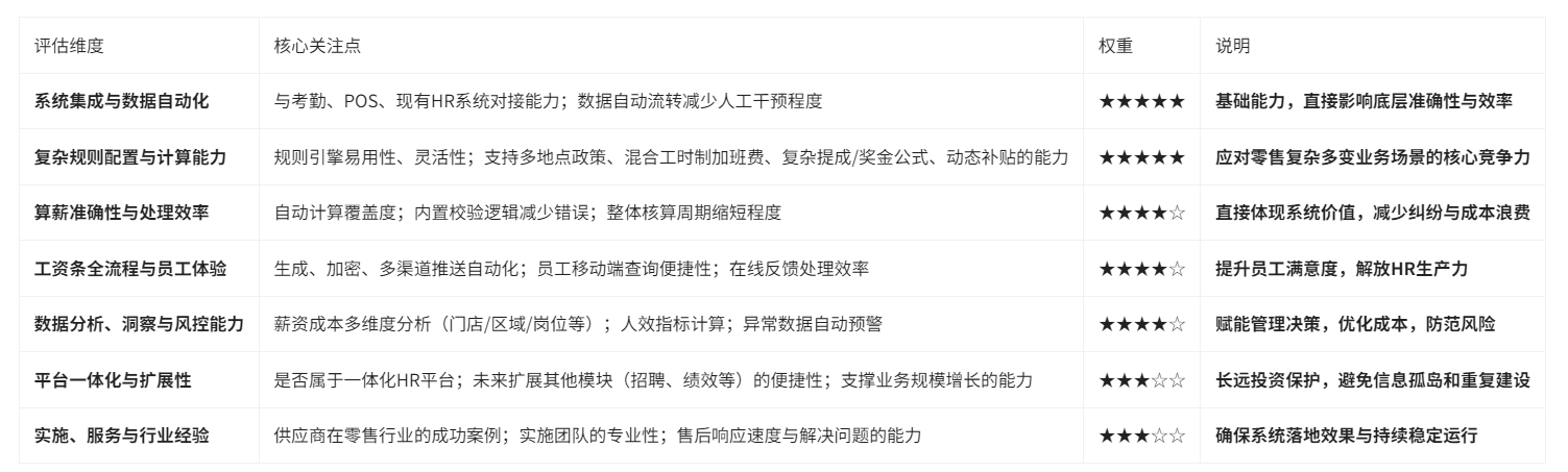 表3:零售连锁门店选型工资条系统核心评估维度与权重建议