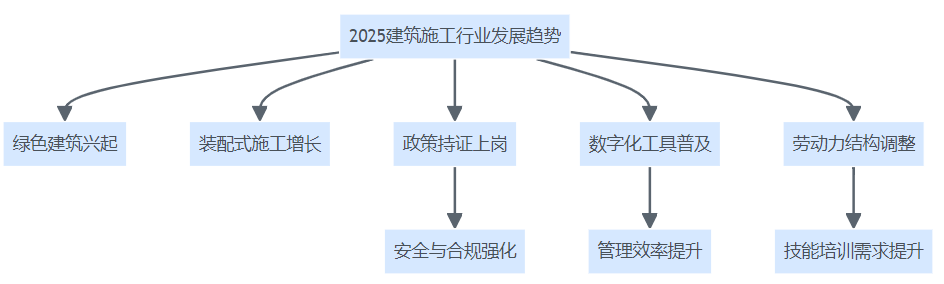 2025年建筑施工行业趋势结构关系图,展示绿色建筑、装配式施工、政策合规、数字化普及与劳动力结构的多重影响。