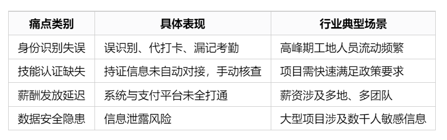建筑劳务实名制系统现状与痛点对比表,突出身份识别、技能认证、薪酬发放和数据安全四大管理难点。