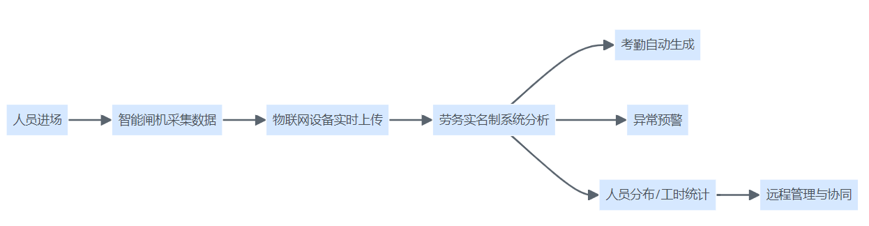 智能劳务管理流程图,展示人员进场到数据采集、系统分析、考勤生成及远程管理全过程。