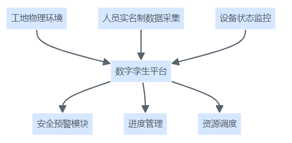 智慧工地数字孪生系统结构图,展示工地环境、人员数据、设备监控与数字平台集成及其在安全、进度、资源管理上的功能流转。