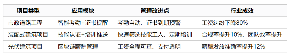 建筑行业劳务实名制系统典型应用场景对比表,展示不同项目类型在考勤、技能认证、薪酬管理上的管理改进与行业成效。