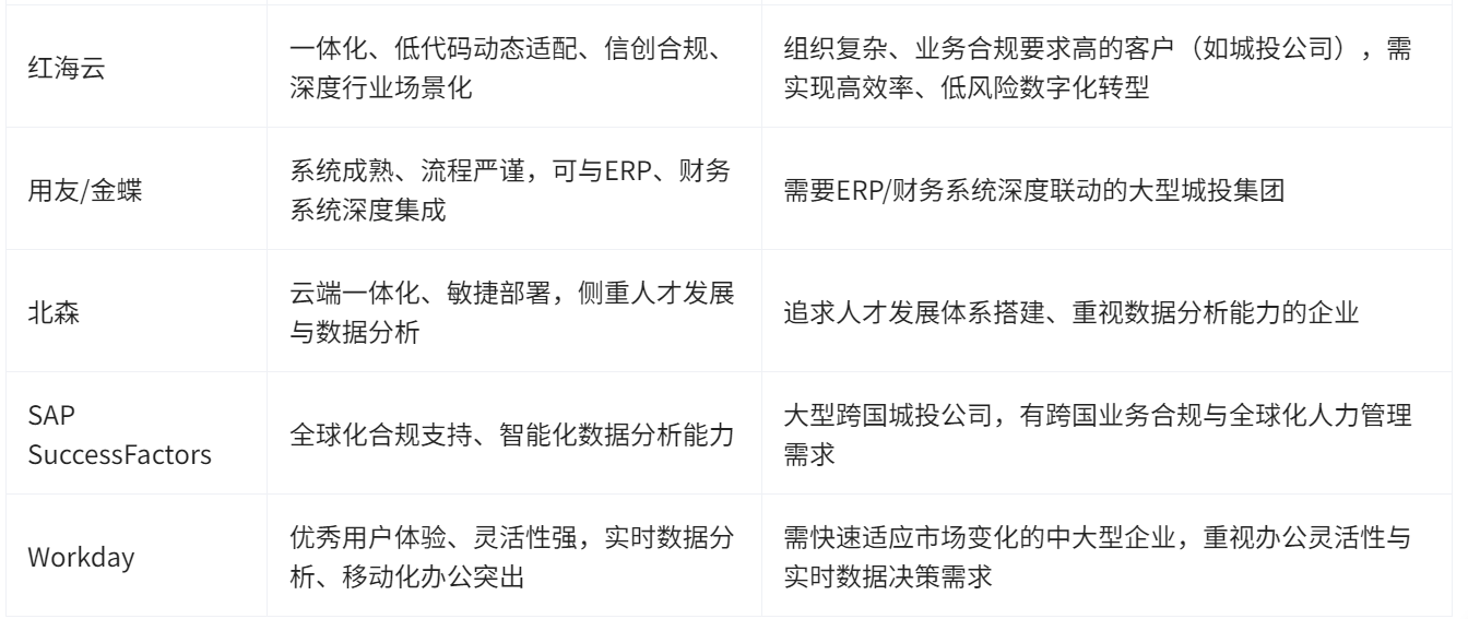 在供应商选择上,城投公司更倾向于有国企服务经验、产品成熟度高、技术实力强的品牌。例如,红海云深耕国有企业HR数字化领域,产品在编制管理、干部管理、薪酬管控、数据安全和智能化应用等方面表现出色。北森以云原生架构和人才管理见长,SAP SuccessFactors、用友等国际和本土品牌则在产品稳定性、功能全面性上有优势。城投公司HR系统选型流程需从需求梳理、市场调研、方案对比、项目实施到后期维护全流程把控。