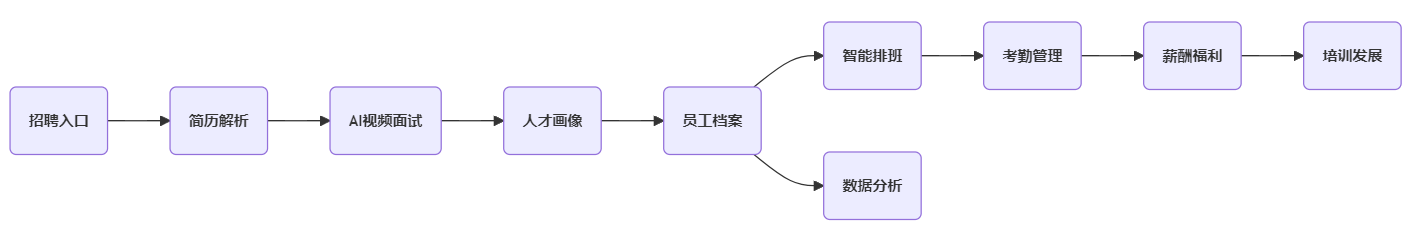 一站式HR系统架构示意图,展示从招聘入口、AI视频面试到智能排班、薪酬福利与数据分析多模块集成。
