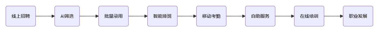 酒店一站式HR管理流程图,从线上招聘到智能排班、移动考勤、在线培训与职业发展全流程协同。